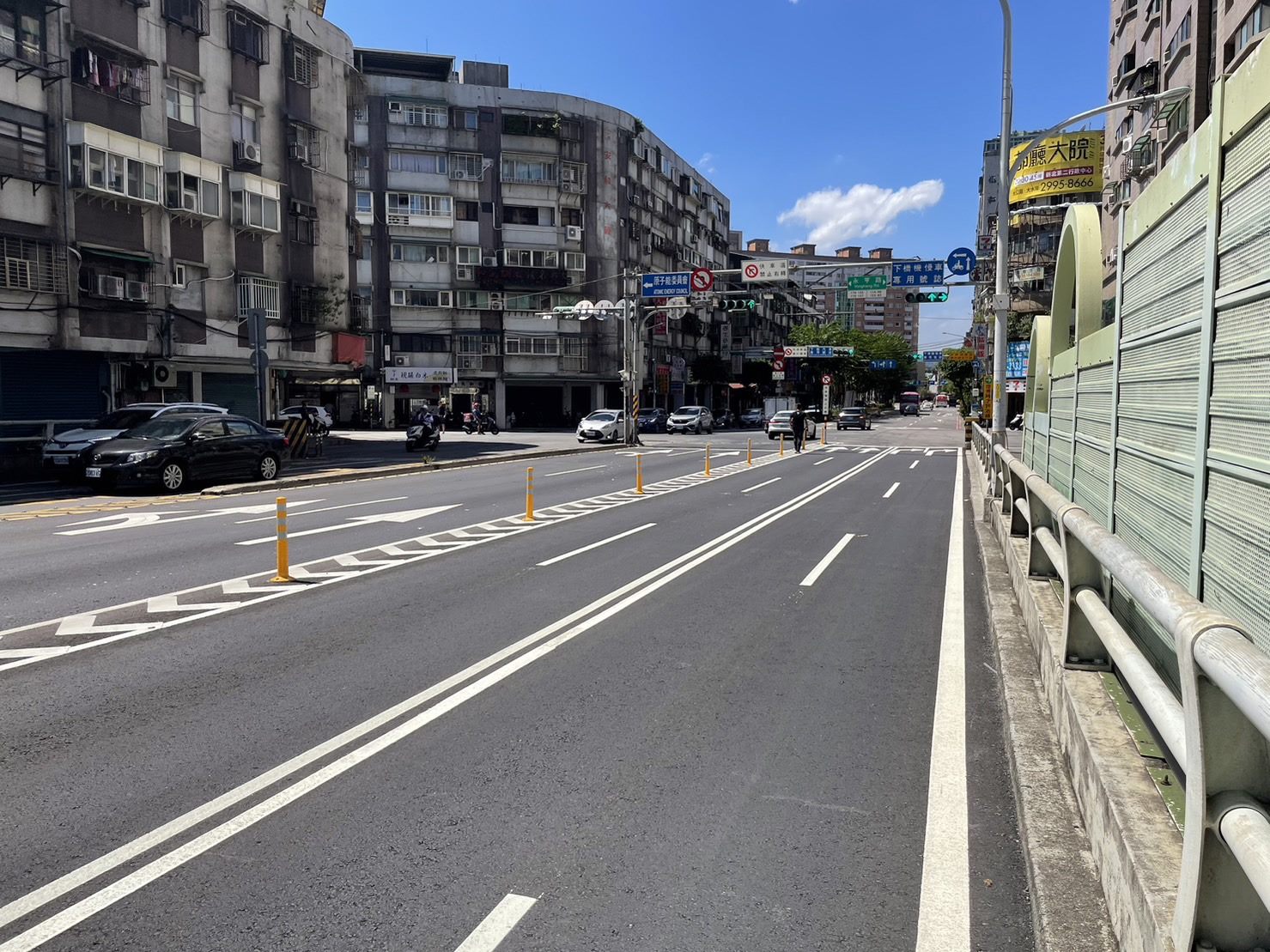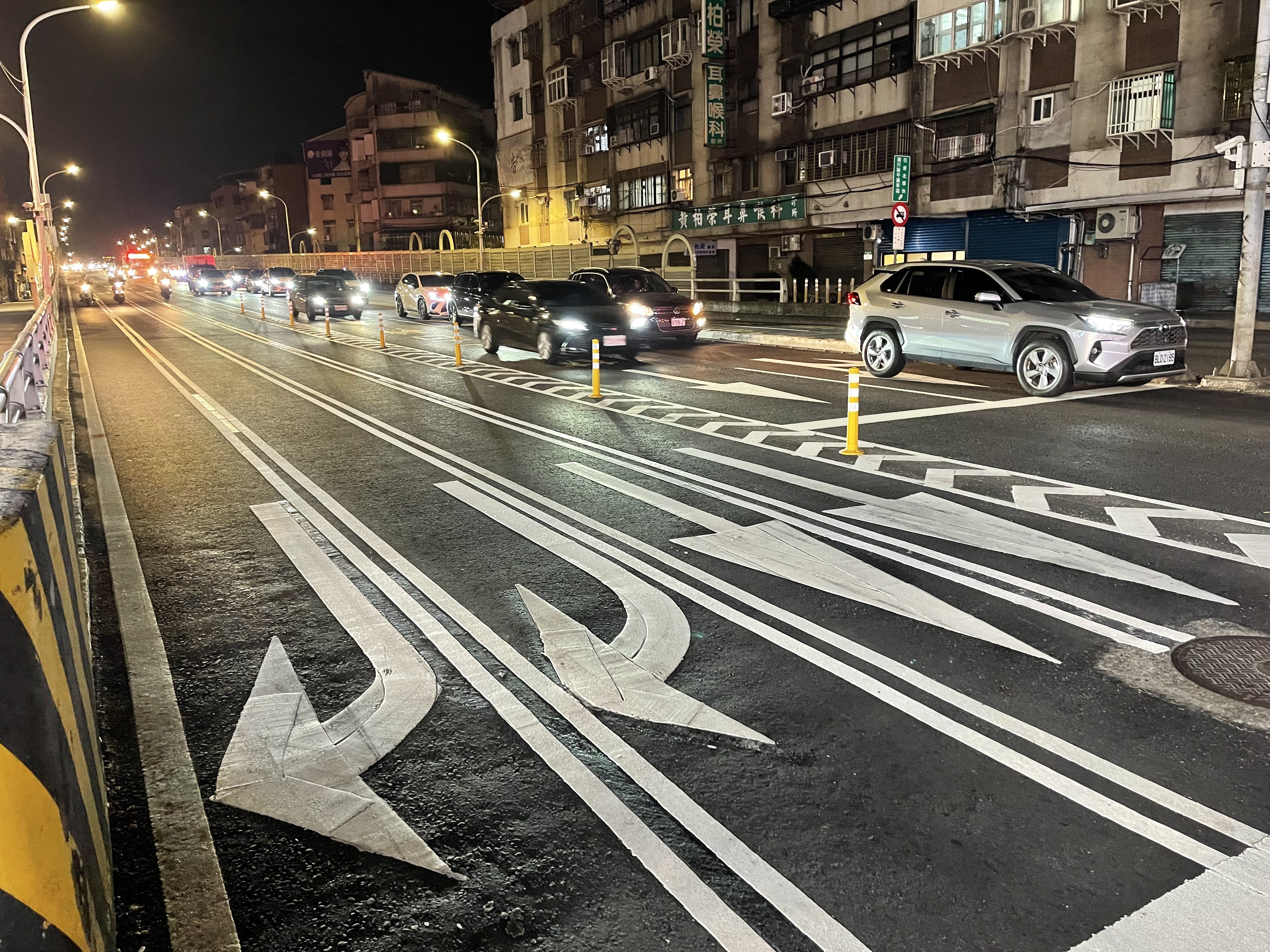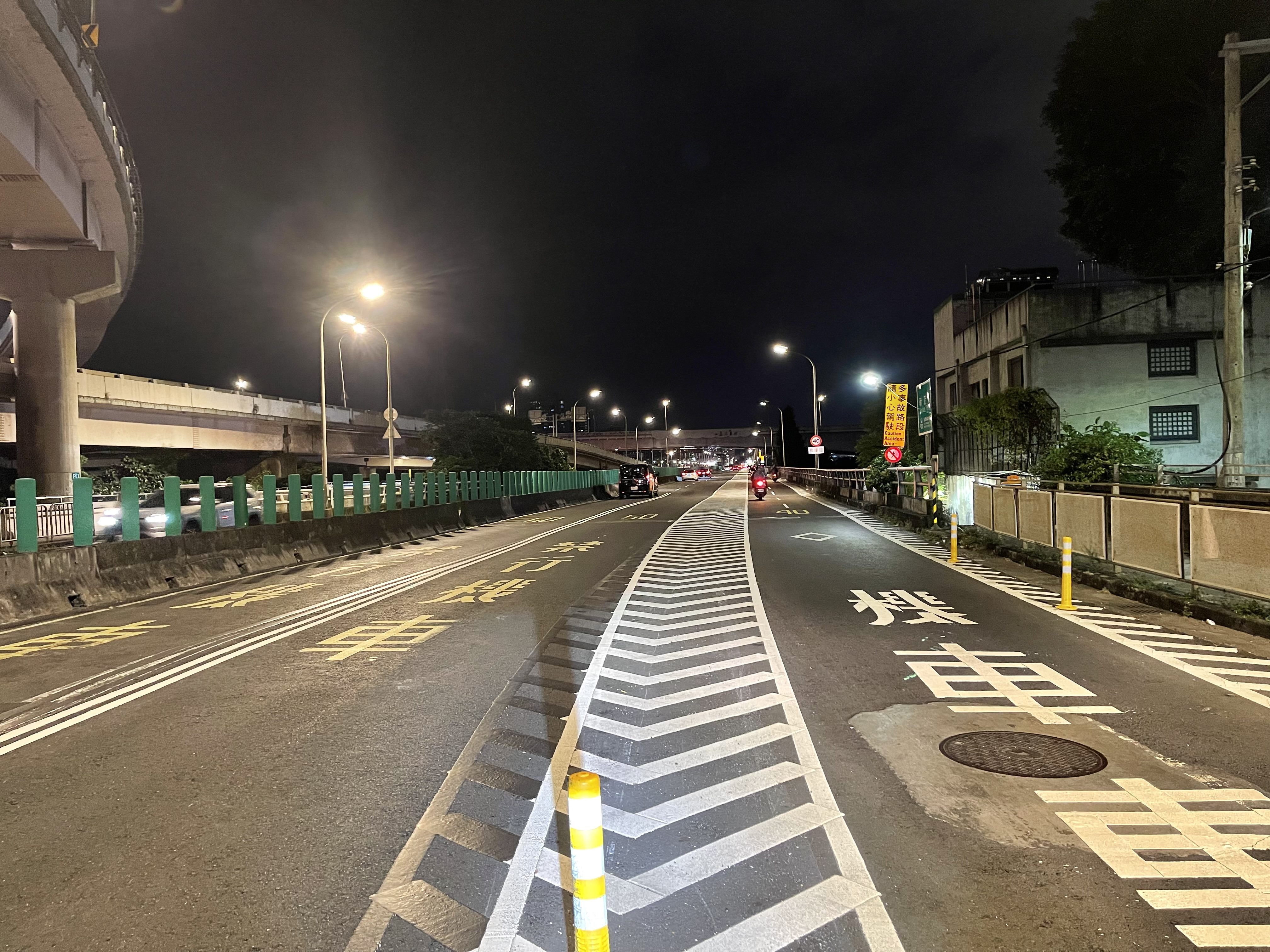 - 工程主要特色:藉由縮減1汽車道,將既有機車道寬度由1.15公尺拓寬至1.5公尺,增加機車行駛安全性及舒適性,並拆除既有汽機車分隔緣石,改劃設槽化線區隔,除減少機車騎乘時壓迫感,槽化區亦可當緊急使用通道。