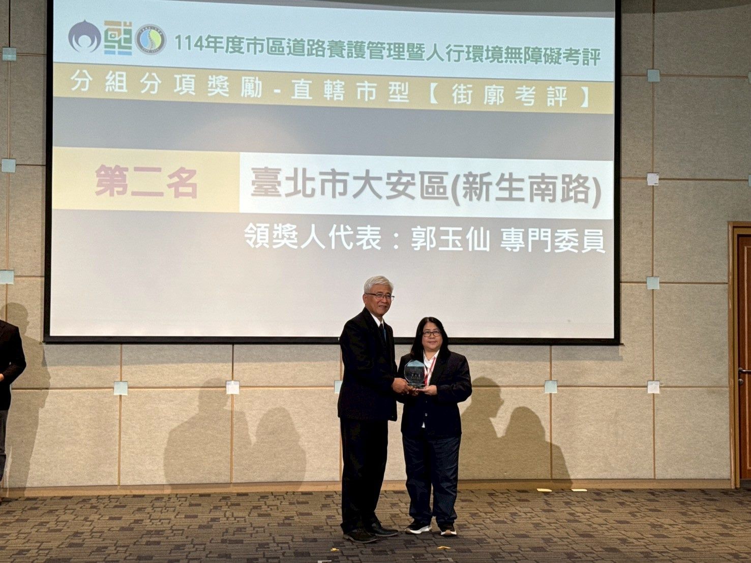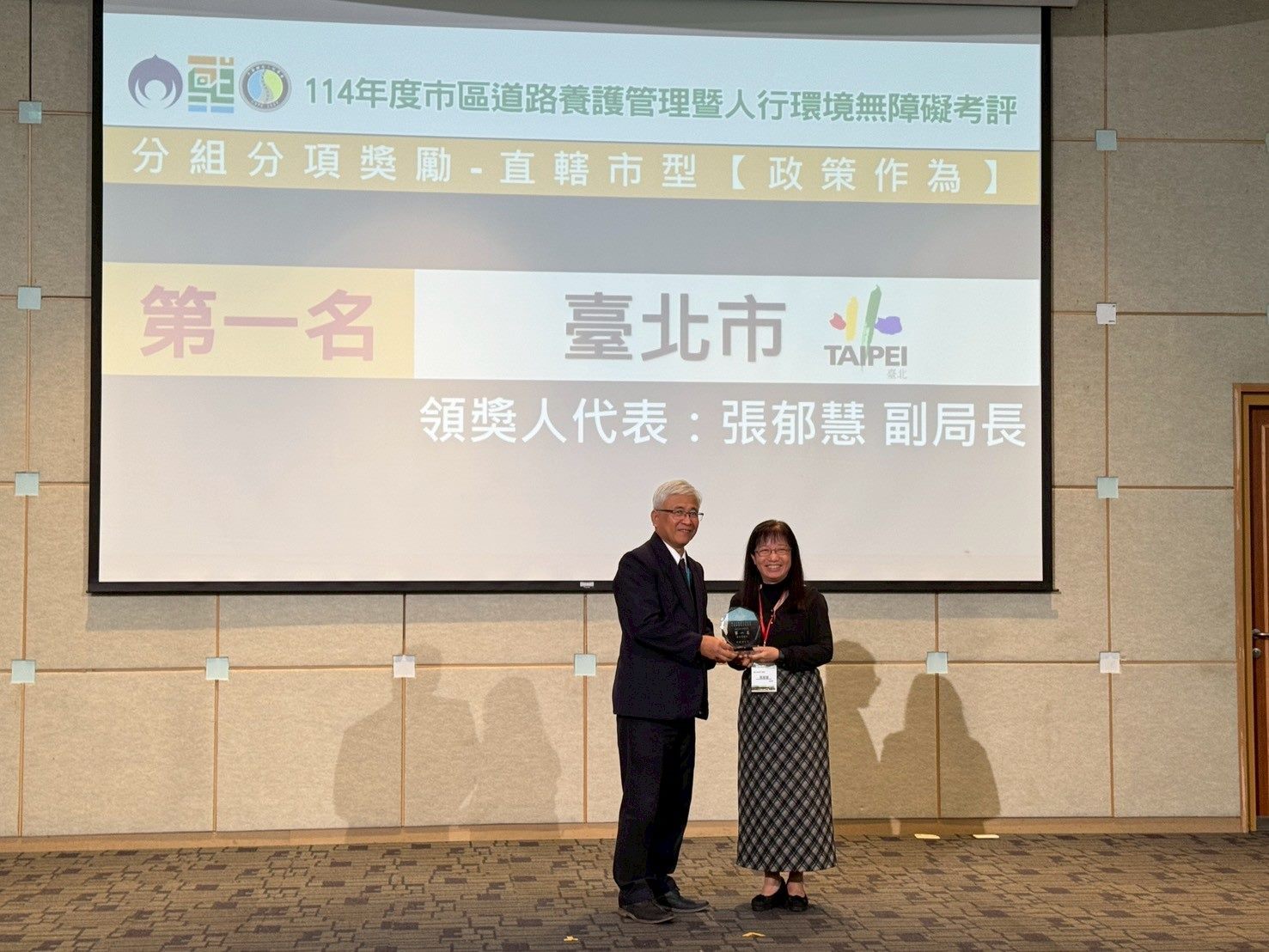 內政部近期於集思交通部國際會議中心舉辦114年度「市區道路養護管理暨人行環境無障礙考評計畫」、113年及114年「都市公園綠地無障礙環境督導計畫」及114年度「共同管道建設考評計畫」頒獎典禮暨研討會,臺北市政府由副市長張溫德率工務局及交通局等相關人員與會受獎。北市府不僅於全國市區道路養護管理暨人行環境無障礙考評計畫「直轄市型」分組及共同管道建設考評計畫等兩大項總成績均獲優等獎項,而在「政策考評」、「道路養護」、「交通工程」、「街廓考評」及「學區考評」等分項中亦獲得直轄市分組第一名之佳績,另外北市信義區興雅里林素琴里長及敦厚里方聰杰里長亦獲頒人本環境改善推動貢獻獎。 臺北市政府工務局新建工程處處長林昆虎表示,臺北市身為首善之都,每年皆積極配合中央政策改善道路及人行環境,也感謝內政部及考評委員多年來的指導與支持,讓臺北市政府從政策面到執行面皆能不斷的精進,除了持續精進改善道路及人行道平整度、人行環境無障礙空間營造及共同管道建設外,更積極開拓各種創新作為以提升整體道路品質,例如道路巡查維護導入成效式契約、建立道路及附屬設施視覺化管理系統、執行人行道淨寬改善計畫等多項創新以及智慧化管理作為,以求持續提升臺北市的道路品質,對於道路品質的精進沒有最好,只有更好。 新工處共同管道科科長竺宣同說明,除了持續推動忠孝東路人行環境改善專案、大安路人行環境改善工程等人本環境改善專案,也配合北市府交通局訂定之「臺北交通安心行」計畫,辦理道路及人行道改善作業,逐步打造本市無障礙之人本環境,執行成果也獲得市民、內政部及考評委員們的肯定,未來臺北市將精益求精、再接再厲,以提供市民朋友人本、韌性、永續的通行環境。