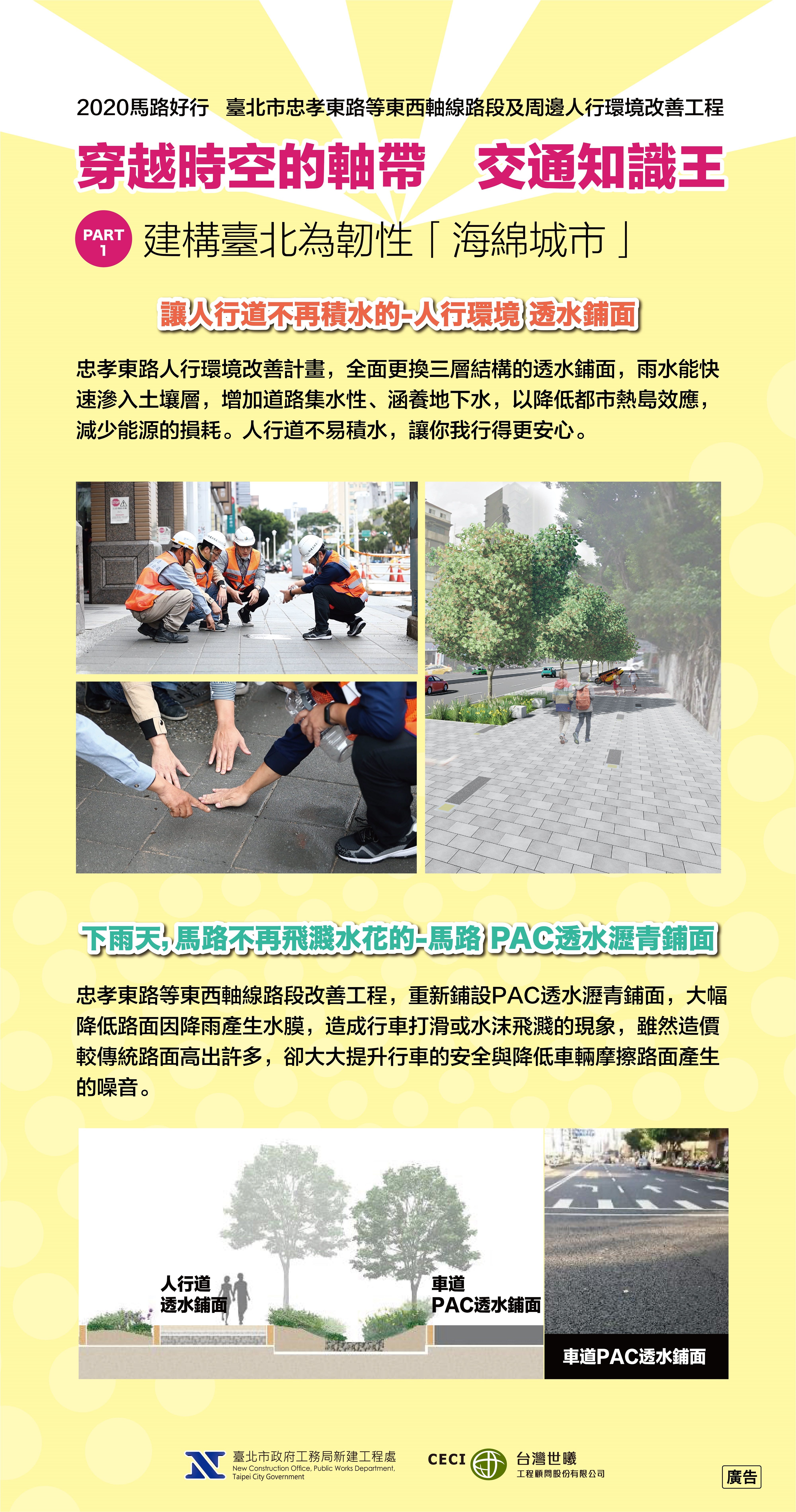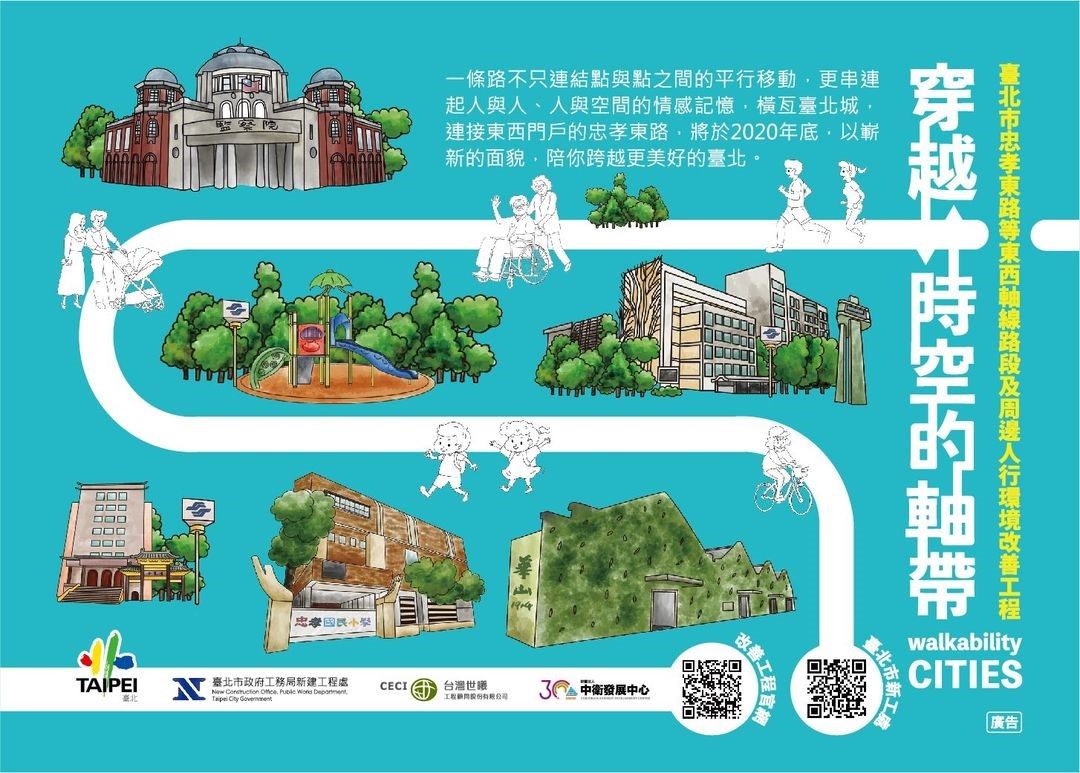 洪維聰繼續說明,當天下午2時新工處將邀請你跟著專業導覽老師的腳步,一起漫步忠孝東路,穿梭於改善後的舒適人行環境空間,細細感受城市在時空更迭、歲月洗禮後散發的人文底蘊,只要全程參加,就能獲得整套「穿越時空的軸帶」系列好禮。活動限額30名,歡迎上網報名(網址:https://forms.gle/j5QTFNvMZKvBcP676 ),與我們共度一個知性與感性兼具的假日時光。