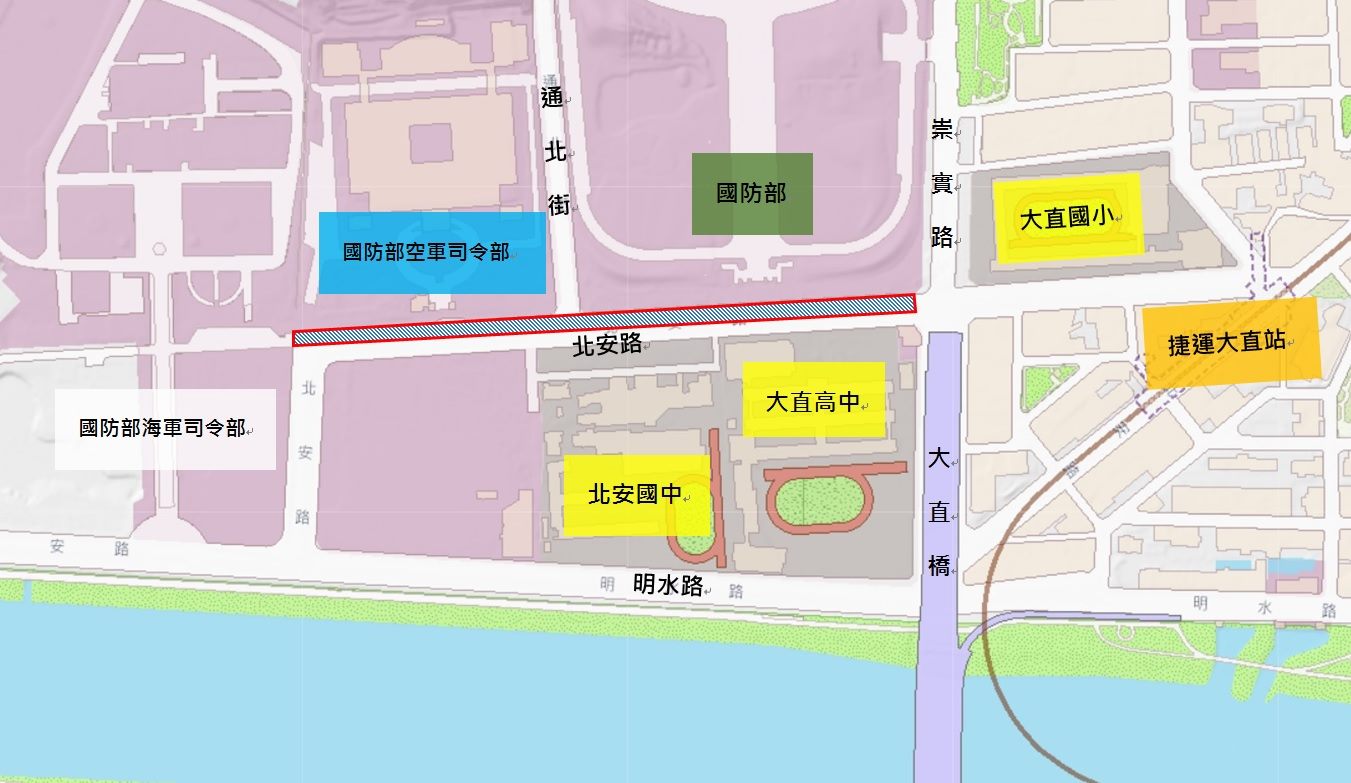 北安路位於臺北市中山區的大直地區,該地區有許多軍事用地的緣故,因此該地區長期受到限建管制,也使得該地區成為臺北市內少見的低密度住宅區,其後區域周邊的美麗華百樂園開幕及臺北捷運內湖線通車後,將內湖科技園區和大直連結在一起,形成一個生活圈,近年附近還有萬豪酒店、美福飯店及百貨商場ATT 4 Recharge相繼進駐,國防部及海軍司令部等機關遷入,連帶讓大直地區的車流人潮大增,加速了道路的耗損,而北安路在經年使用後,路面不平整、龜裂及凹陷等問題發生頻率越來越高,因此臺北市政府工務局新建工程處於今(109)年陸續辦理北安路東往西車道(崇實路口至國防部海軍司令部側門前)路面更新工程,路面更新長度約為532公尺,工程經費約419萬元,已於近期全數完工,提供市民更為平坦舒適好行的路面。