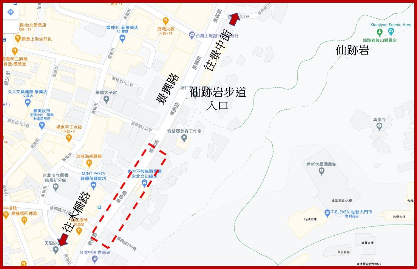景興路,位於臺北市文山區的一條道路,道路的東側就緊臨著仙跡岩,而在景興路243巷的仙跡岩入口牌坊延續至木柵路一段間,沿線或為建物或為擋土牆,其中台灣中油世新站至木柵路一段間的擋土牆牆面,之前已由臺北市政府工務局大地工程處以燒陶型塑樹木、飛鳥、走獸等圖案美化完成。餘下的路段(景興路243巷至台灣中油世新站)則在近期由工務局新建工程處設置八仙陶塑呼應仙跡岩的傳說,為原來枯噪乏味的擋土牆帶來更多的趣味。